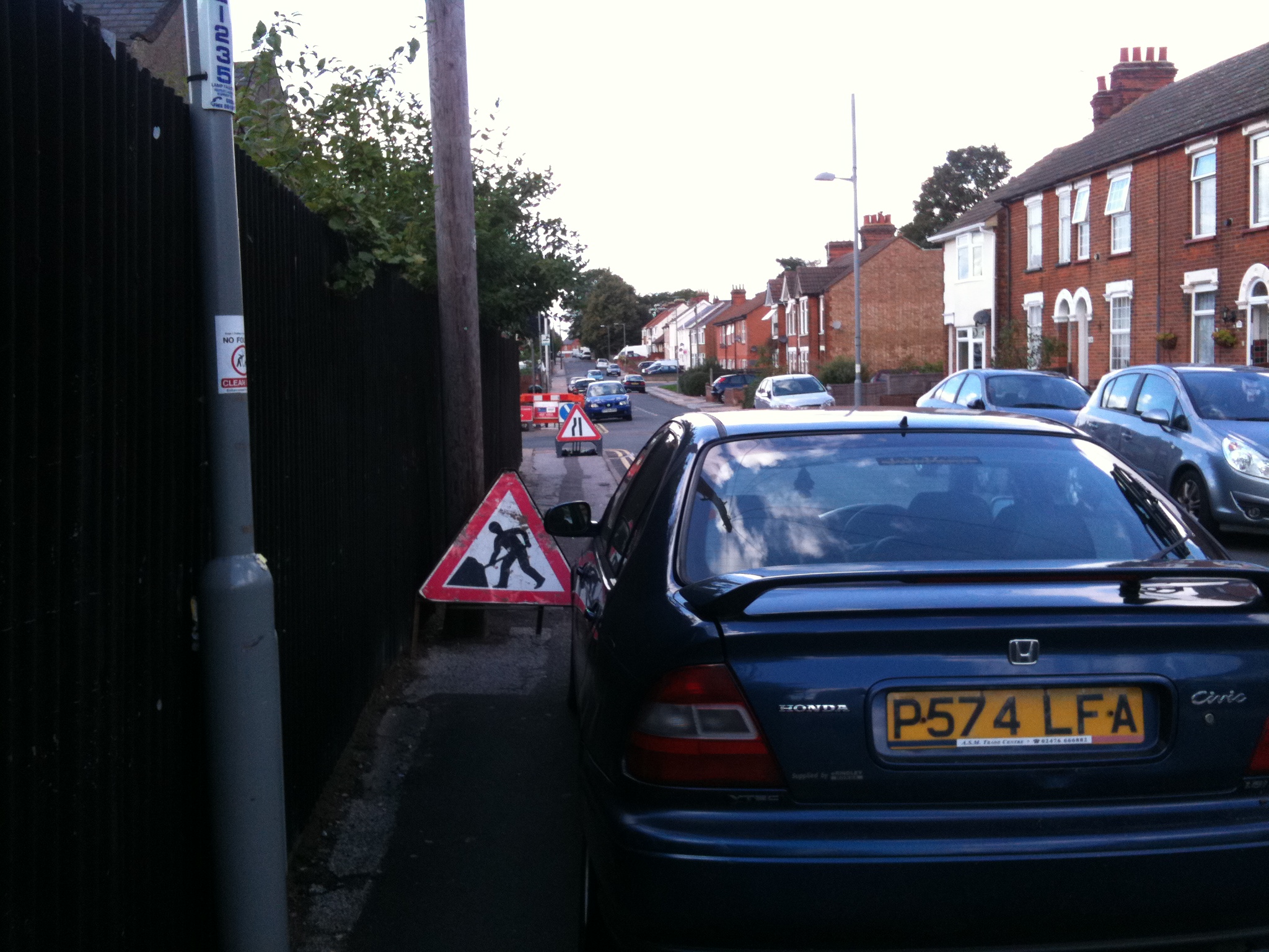 I don’t think that the authors considered these real life situations in our car littered towns. In this first example the road works are between two parked cars so the road is not actually narrowed, but the pavement certainly is!