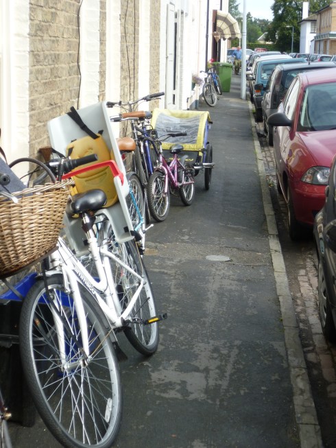 In Cambridge cycles are making this own claims to the pavement. In this street the back gardens were sold for housing which lost them their back access so the bikes and trailers now end up on the pavement. Possibly a cycle rack in the road in place of a resident parking bay would be in order? I have spoken to a London Borough who wished to do just this, however their legal guys thought that while it was legal to leave a big vehicle on the highway that it was possibly not legal to install cycle racks. They may have a point, but equally according to the Law it is not legal to leave any ‘thing’ in the highway and that includes cars.