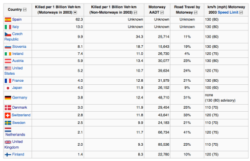 The Wikipedia Road Safety Article has a useful table which shows motorway casualty rates in the first column and speed limits in the right column (this is not properly referenced though). Is it just me or is it significant that all the worst countries have high speed limits and all the most safe countries have low ones?