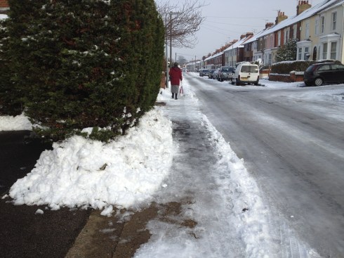 So there you have it. Yes – a few people are able to park really close to where they are going and can then slither along like everyone else when trying to actually get to their destination. But.. no, it is not attractive and I can’t believe that there has not been a shop-keeper or shop-assistant who would not have been able to find time this week to clear it.