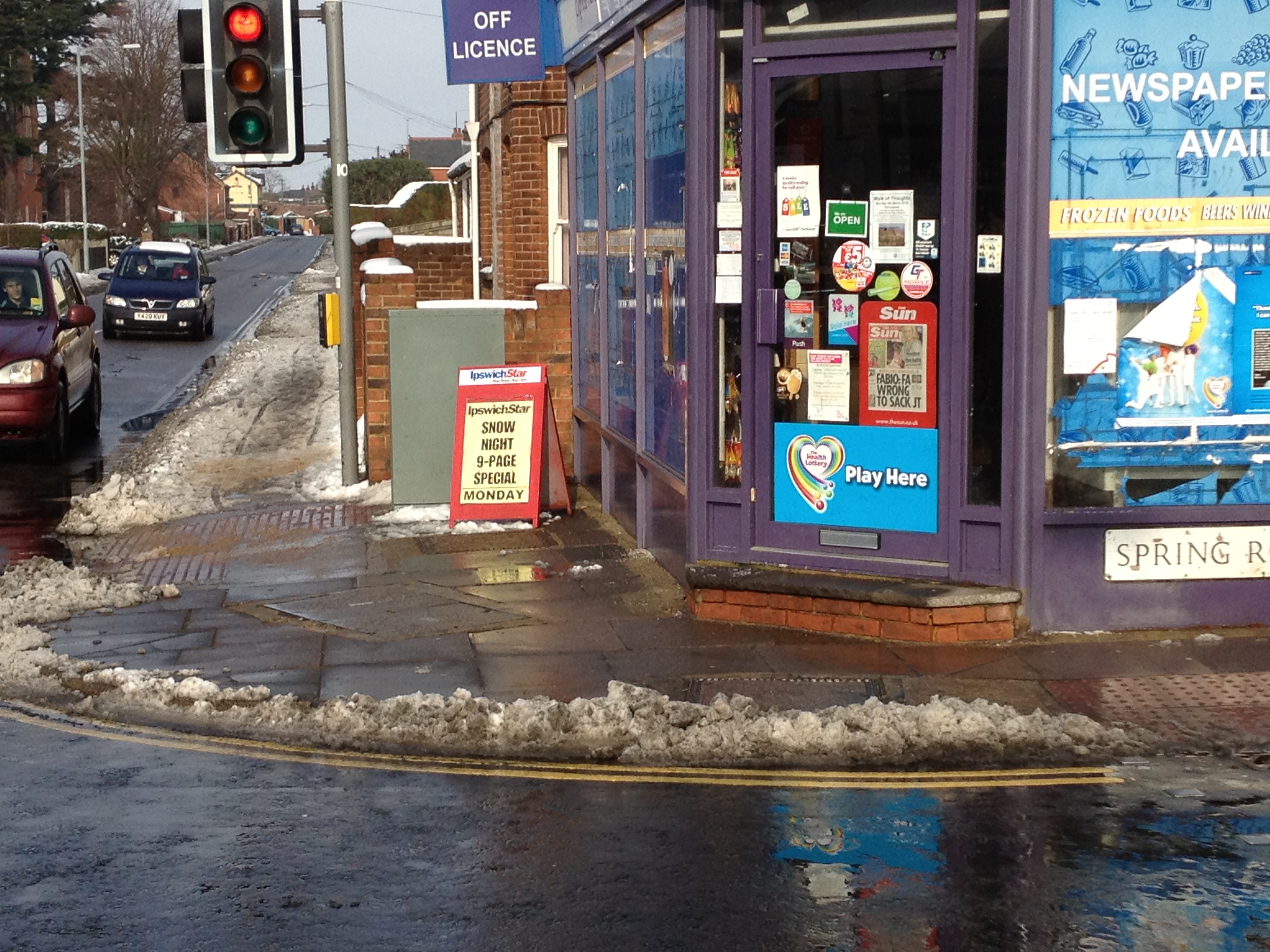 My story takes place along this row on shops is on the south side of Felixstowe Road at the junction with Derby Road in Ipswich (See it on Google streetview). Being on the south side does of course mean that they have had no sun on the pavements to help clear them. You should also be aware that the legal footway stops in front of the post-box and telephone box. The land behind is private property and the shop-keepers can do what they like with. The footway should be keep clear for pedestrians, however they are would probably get more custom by attracting people to walk past their doors. Interestingly, they could also be legally liable for anyone who slip over while coming to their shops which is not something that I think they have considered. Here is the street scene back when it was warm when the Google Streetview car came through town.