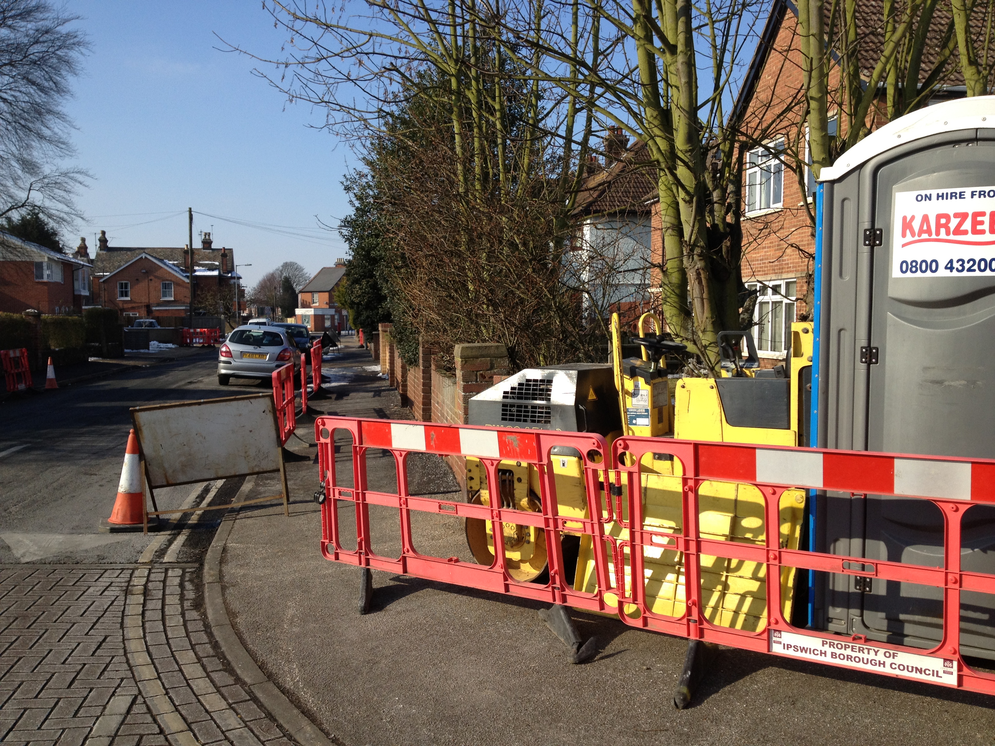 Back in Ipswich, I spotted Ipswich Borough Council doing more repairs to the local pavements which is good, however I can’t help thinking that they could have organised the barrier around their roller and portable toilet a bit better. To their credit they did adjust it to reduce the problem after I had taken the picture, but why wait for someone to point it out? They continue to leave signs illegally obstructing the pavements, but that isn’t news any more so I will leave the pictures this time.