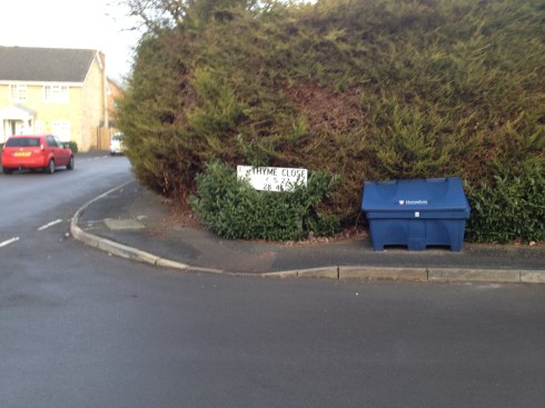 16 FebJust spotted this grit-bin plonked down across a pavement by Hampshire County Council. Shame that they couldn’t find anywhere for it which wasn’t blocking the pavement for buggy and wheel-chair users, especially as they had been to the effort to create a dropped kerb. The hedge could do with a trim as well.