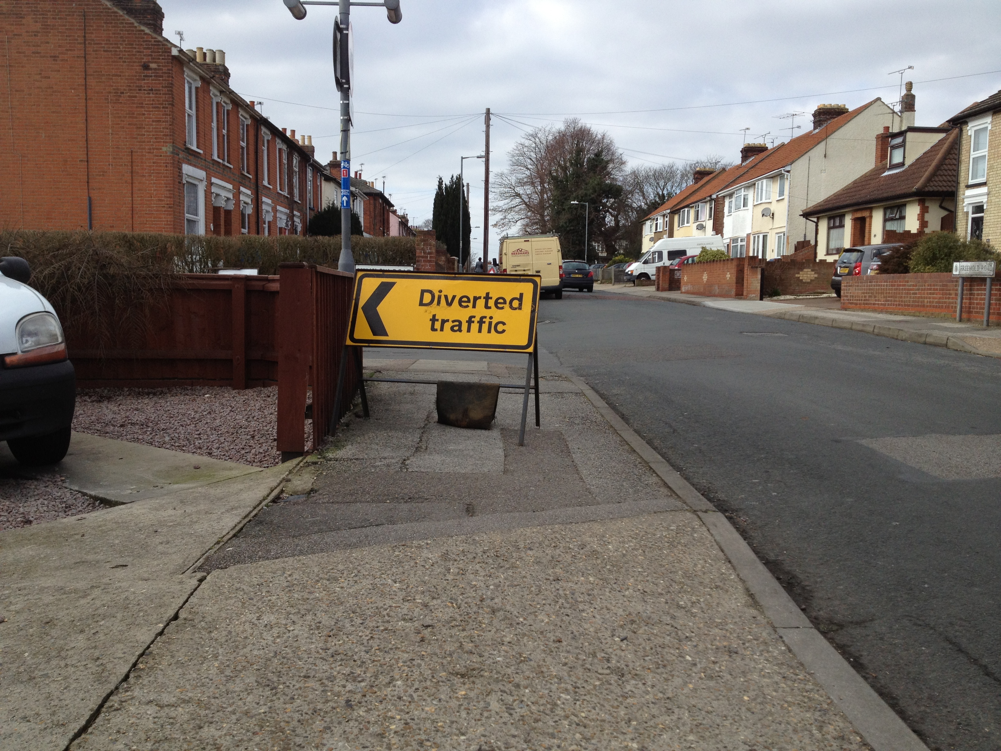25 FebTraffic Management explain on their website that they offer ‘a safer method of Traffic Management’ – curious, given that they have almost completely blocked a pavement in Ipswich with motorist diversion signs forcing pedestrians into the road. These signs leave about 300mm of width of the pavement, which is less than half that of a typical 2′ 6″ internal doorway in a house and far less than the absolute minimum of 1 meter required by law. I phoned their emergence number this morning (which was helpfully printed on the back of one of their signs) and asked them to move them in the next few hours. Lets see what happens. (see below for update – very impressive response time and attitude – thank you).