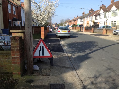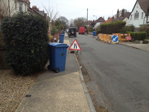 Next up, we have a delightful combination of bin day and road works. The road signs from May Guerney do at least leave the legally required 1m clearance this time, but unfortunately they create a chicane for pedestrians when combined with the bins that have been left scattered as usual across the pavement by the council making it impossible for my wheelchair-bound neighbour to use the pavement. Possibly he should just stay at home on bin-day? Or possibly the council should instruct their staff to return bins onto drive-ways where they are available and road-works signs should only be used where they are actually required for safety reasons!