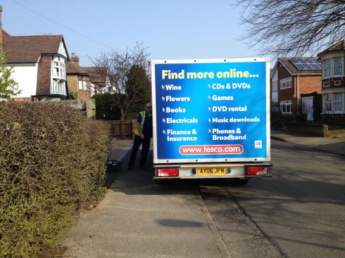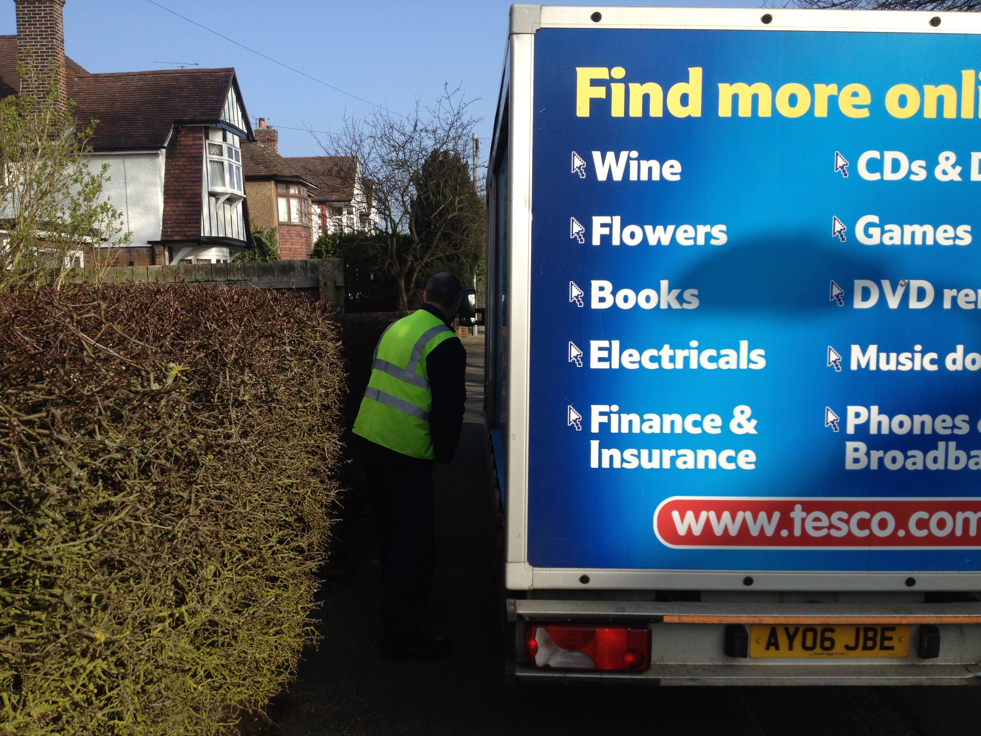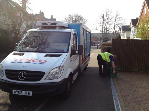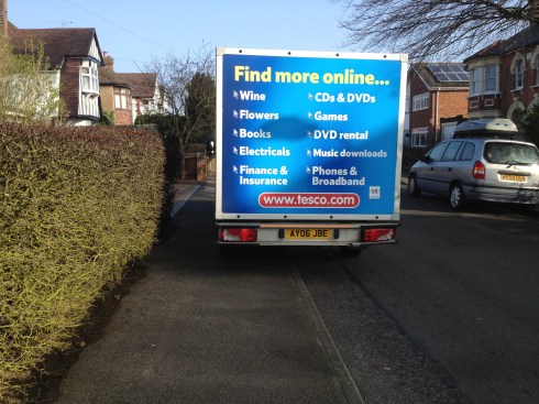 First off, there is the Tesco delivery truck this morning. The driver said that he had received no guidance at all on where it was acceptable to park and where it wasn’t (not that I believe that really, possibly it is more a matter of ‘don’t ask, don’t tell‘). The driver was parked so far up onto the pavement today that I could hardly get past at all without being scratched by the prickly hedge; the local guy in his wheel-chair would have no chance. As usual there was a space for the driver to park on the other side of the road, but that would have increased his drop-off time by, ohhh, possibly at least a minute and we all know that for Tesco ‘every penny counts’!