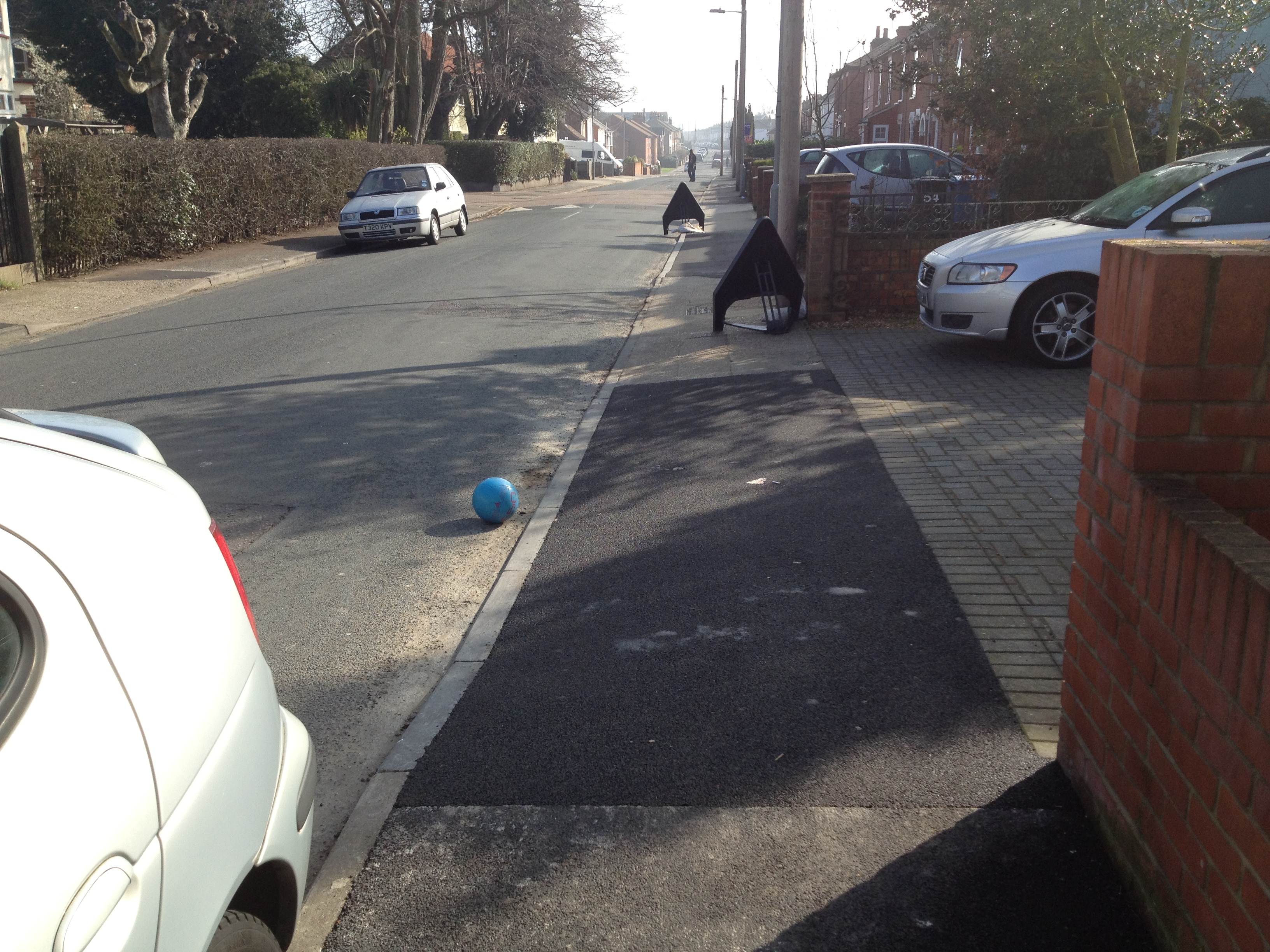 And here is the result. And to illustrate the slope, I place the football at the curtilage (where the pavement joins the property) and watched it roll across the ‘pavement’ into the carriageway before settling in the gutter. Not helpful for wheelchair and buggy users. Do also notice the road-works sign (see below).