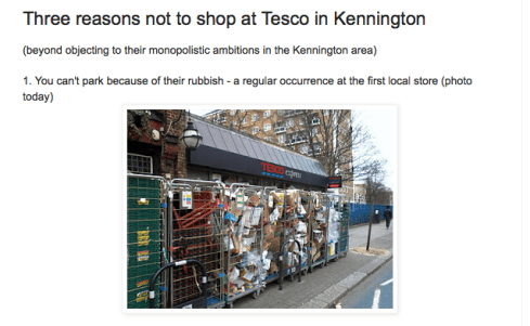 What is very interesting about this is that Tesco (and just about everyone else who parks on the pavement) appears to be breaking section 72 of the delightfully old Highways Act 1835 which is still in force and is probably one of the most powerful laws available to us which states that it is an offense: “If any person shall wilfully ride upon any footpath or causeway by the side of any road made or set apart for the use or accommodation of foot passengers; or shall wilfully lead or drive any horse, ass, sheep, mule, swine, or cattle or carriage of any description, or any truck or sledge, upon any such footpath or causeway“. The great thing about that law is that there is very little wriggle room – there in nothing about such driving needing to be ‘unreasonable’, ‘unnecessary’ which makes the obstruction law so useless. All one needs is suitable evidence which can be provided by virtually by a mobile phone with video recording capability. Any recording needs to show the situation, the pavement, the vehicle registration number and the driver’s face. The offense can lead to a fine of ‘Level 2 on the standard scale‘ which is currently a maximum of £500 which might make them pay some attention. It would of course be necessary to convince a court that it was worth their time to bring it to court. This is certainly something to explore in much more detail going forward.
