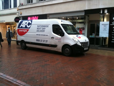 I passed a UK Mail delivery van parked on the zig-zag lines by a pedestrian crossing yesterday. I asked him politely to move and he responded saying he was allowed to stay there for 5 minutes. wrong! When I challenged him I got a tirade of abuse including words beginning with F and P together with the ‘get a real job’ and ‘people like you need a smack in the gob’ etc. Not exactly what on expects from postman pat! Update… see bottom of post for an impressive, prompt and helpful response from UK Mail to this particular incident.