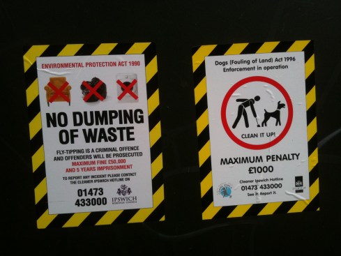 1 SepThe council has recently put up signs in the area warning of penalties including fines of up to 50K fines and five years in prison for dumping rubbish on the pavement. Serious stuff! I assume there are referring to the Environmental Protection Act 1990 (section 33). Unfortunately they then go and leave wheelie-bins all over the pavement every week after collection! The following two pictures are taken on the same street. The first shows signs warning that dog poo on the pavement costs up to £1,000 and the fines for fly-tipping. The second photo shows how the council leave bins all over the pavement after emptying them for no good reason that I can discover. Cars on the pavement are not being challenged of course.