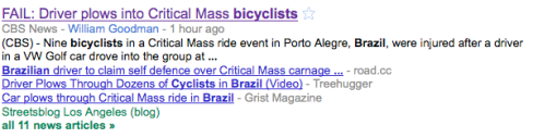 I have done a quick little survey of what transport safety stories have hit the news in the past few days. I was prompted to do this when I noticed that a horrific story from Brazil about a car driver who drove at speed through a throng of cyclists taking part in Critical Mass had only resulted in 3 stories in the main-stream media (on CBS, Sky and just now also on the BBC) according to Google News. Update: This story has just hit mainstream media, and Google now reports over 200 articles around the world. It did however take four days to do so, and only went mainstream after the driver was brought in for questioning. The event took place on Friday evening, and by Monday evening this was what Google reported, only 11 articles of which most were cycling media: