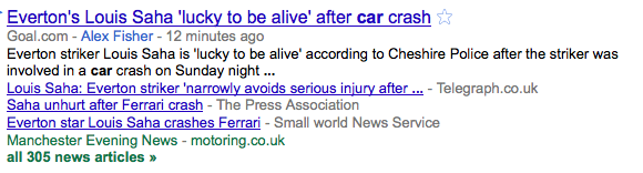 And finally there was the story about ‘the footballer who crashed his fast car’. Where have I heard that one before? Result: 305 articles.