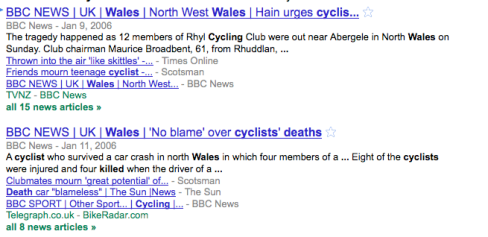For comparison, here are the stories that relate to terrible 2006 incident where a car driver slipped on ice and crashed into a group of cyclists and killed 4 of them including a 14yo boy which only resulted in 15 news stories that Google News can find today. The drive, who admitted that he may ‘very possibly’ have been driving too fast, was only fined a total of £180 with £35 costs and given 6 points on his license.