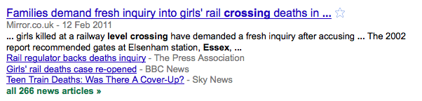 Go back a few weeks there was the story that a possible new inquiry into the deaths of two teenagers who died five years ago while crossing a railway line at a level crossing when the warning lights were flashing. 266 articles for that one, including a front-page story in The Times.
