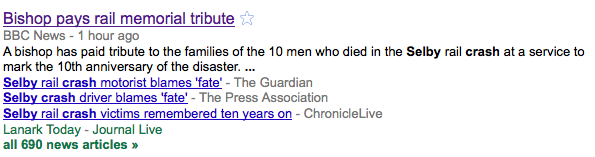 Then there were the 690 news stories acknowledging the 10th anniversary of the ‘Selby rail crash’, which should more accurately be called the ‘Land Rover driver kills 10 rail passengers crash’. Incidentally the driver of the Land Rover was out of jail after serving 30 months of his 5 year term.