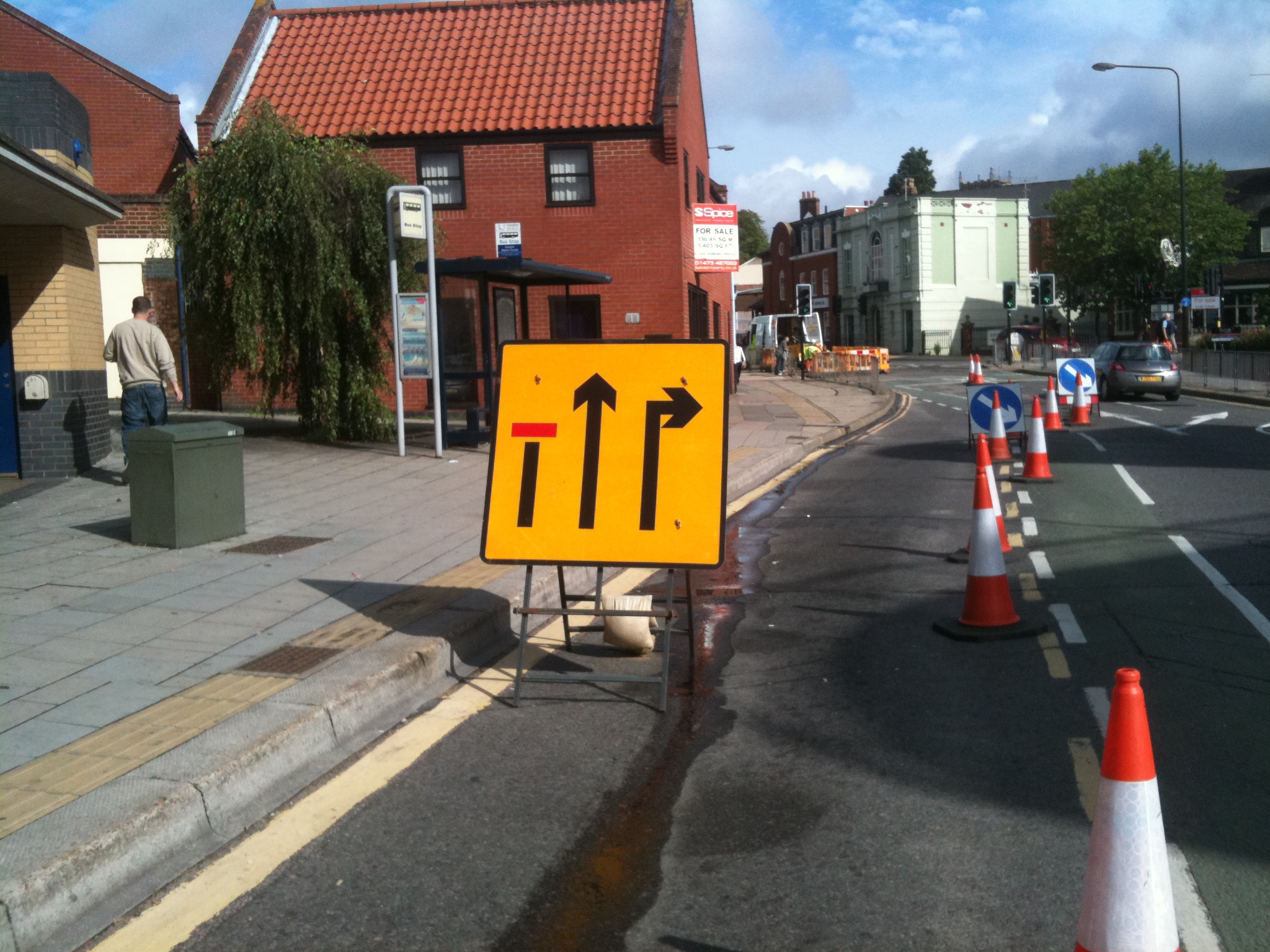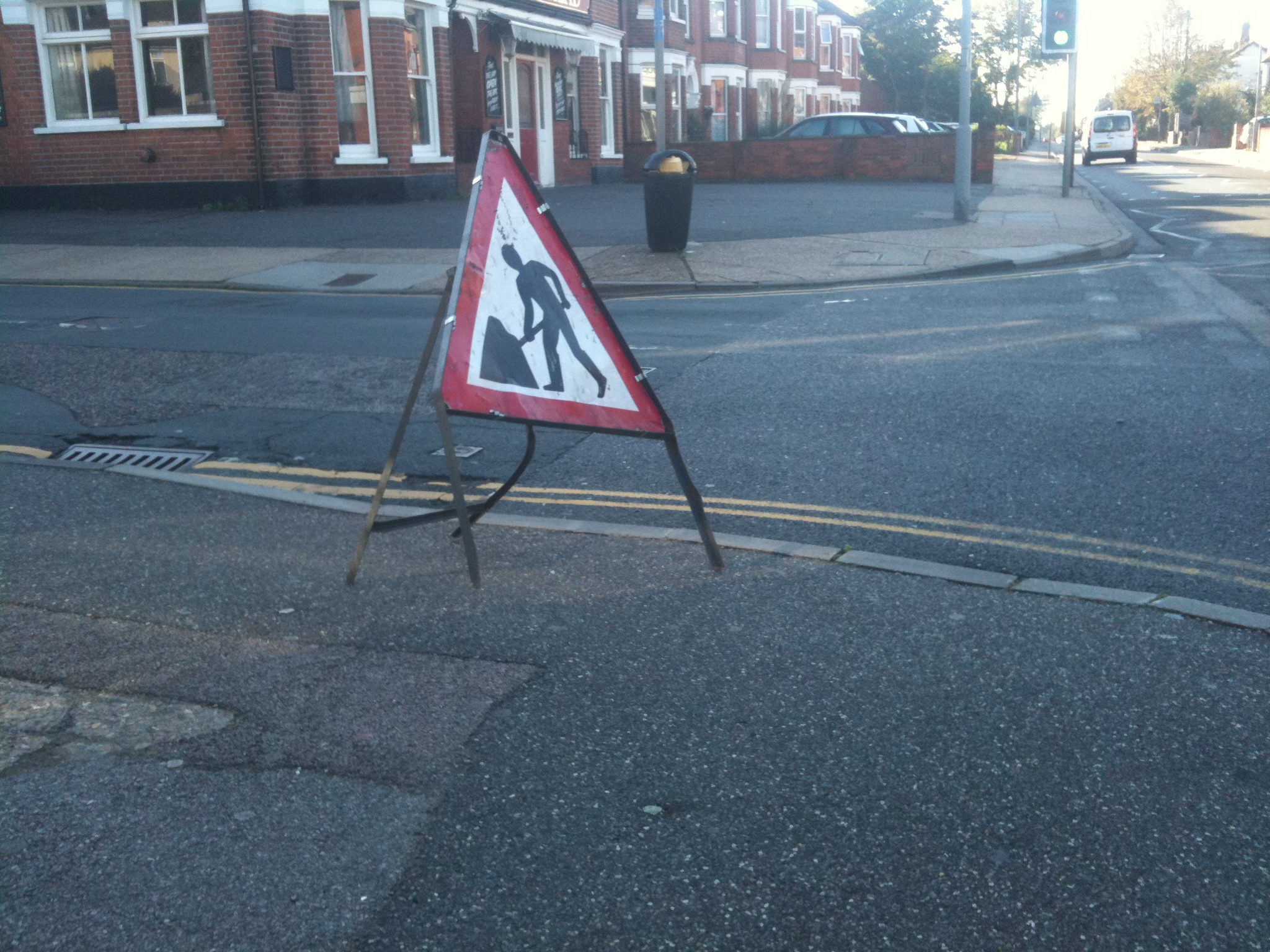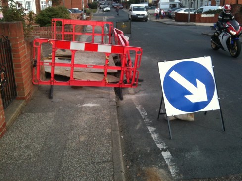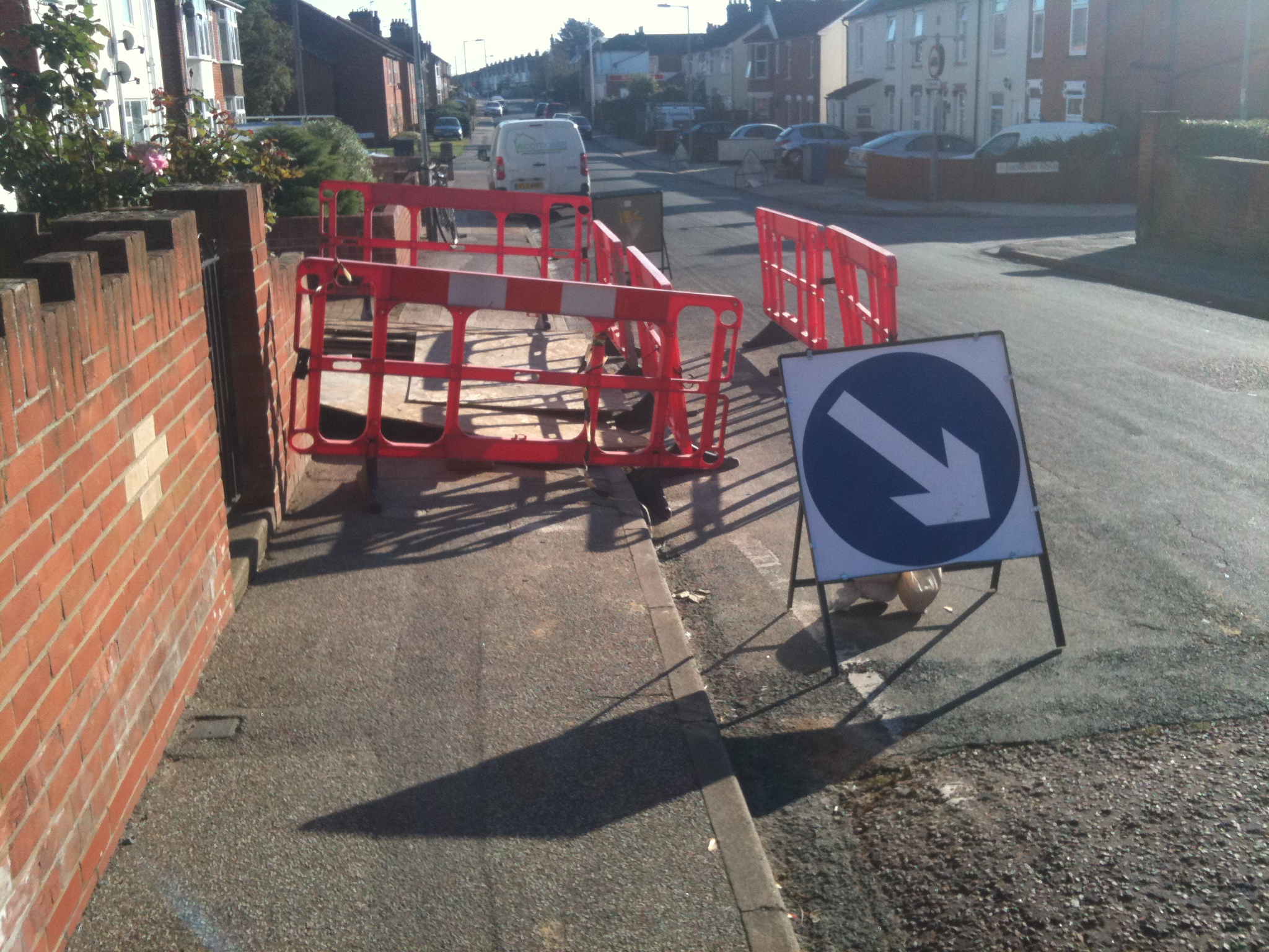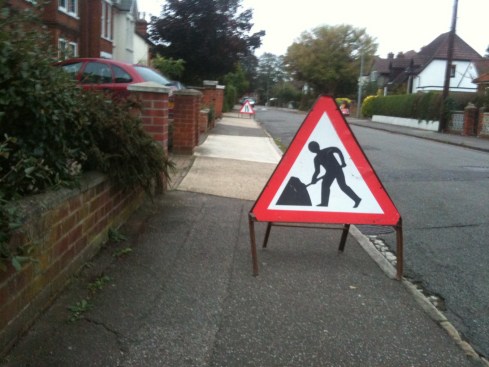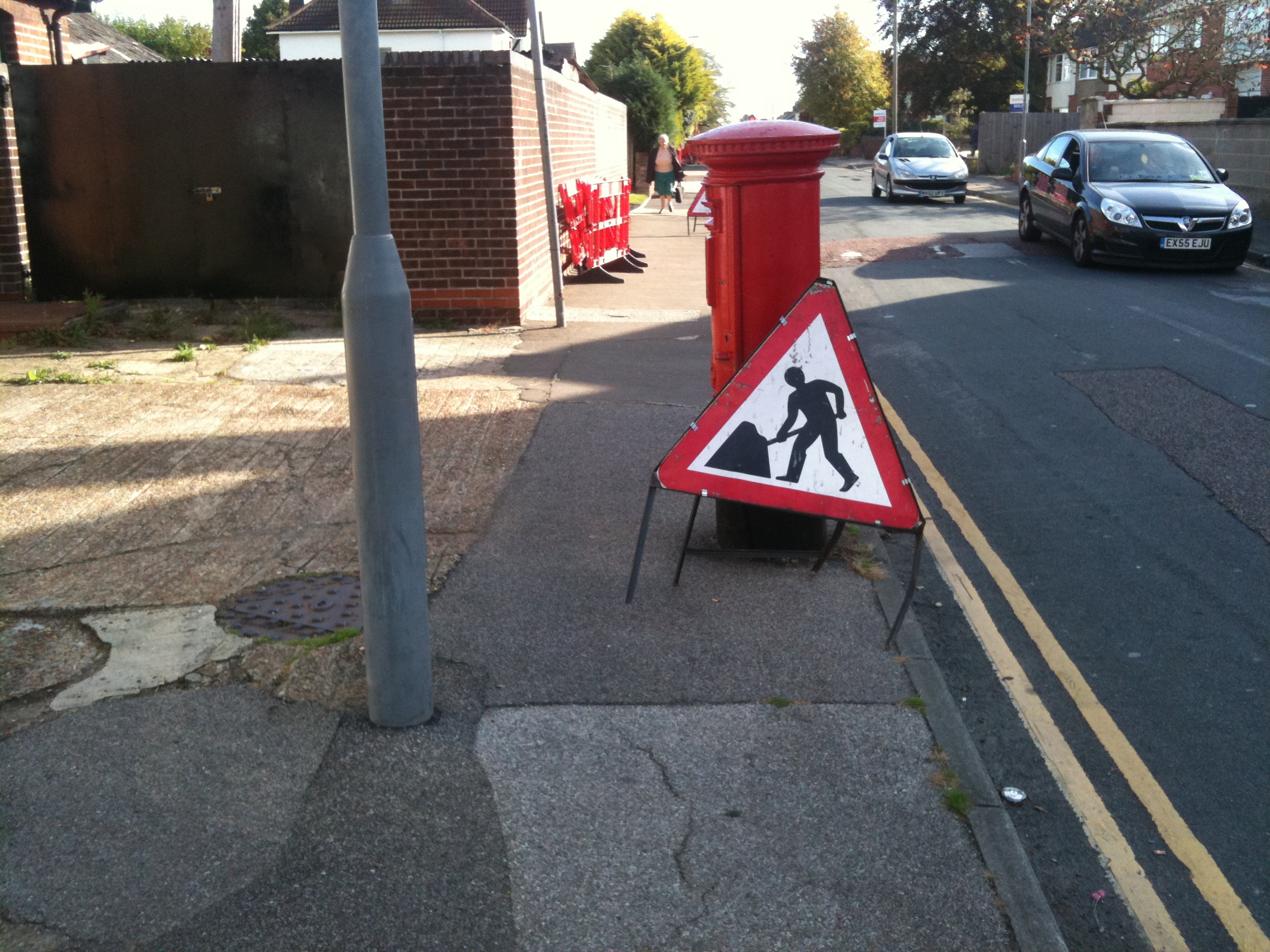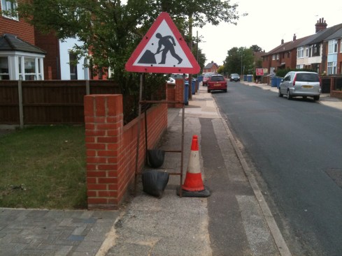 Next up, we have a delightful combination of bin day and road works. The road signs from May Guerney do at least leave the legally required 1m clearance this time, but unfortunately they create a chicane for pedestrians when combined with the bins that have been left scattered as usual across the pavement by the council making it impossible for my wheelchair-bound neighbour to use the pavement. Possibly he should just stay at home on bin-day? Or possibly the council should instruct their staff to return bins onto drive-ways where they are available and road-works signs should only be used where they are actually required for safety reasons!