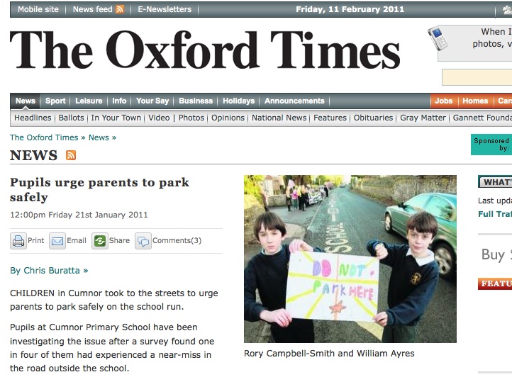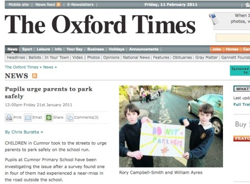 Cumnor, Oxfordshire: “Children in Cumnor took to the streets to urge parents to park safely on the school run. Pupils at Cumnor Primary School have been investigating the issue after a survey found one in four of them had experienced a near-miss in the road outside the school. And they decided that parents parking on pavements and zig-zag lines were causing the safety problems in Oxford Road. To hammer their message home, they made special banners and staged a protest at school closing time, backed up by a letter that was sent home to their parents.