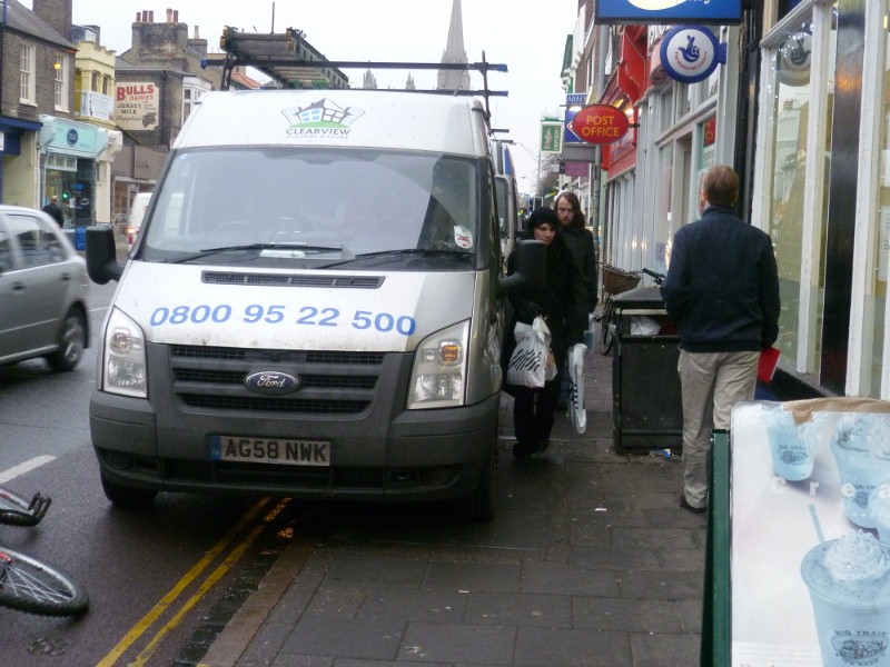 A van stops to unload and parking on the pavement on double yellow lines by a litter bin outside a post-office. People can get by with their shopping as long at they turn sideways and take turns in either direction.