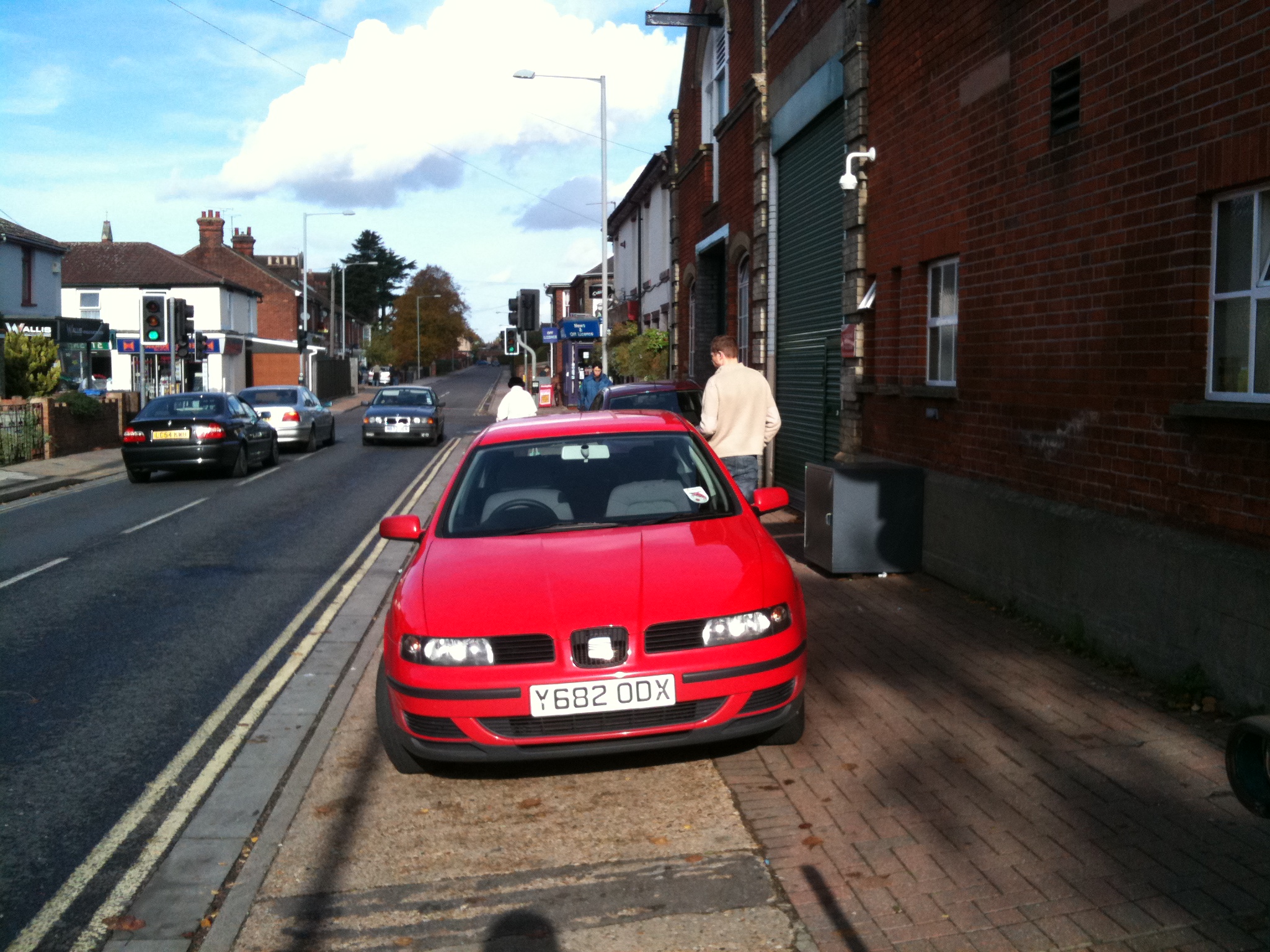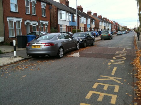 These cars are parked on St John’s Road, Ipswich, the blue car is on the road marked with a single yellow line, the red one is on the pavement opposite a double yellow, the black one is on parked fully on private land belonging to the shop.  The sign near the single yellow says ‘8am-6pm Mon-Fri.  The photo was taken at 4pm on Tuesday. Please answer for all three cars.