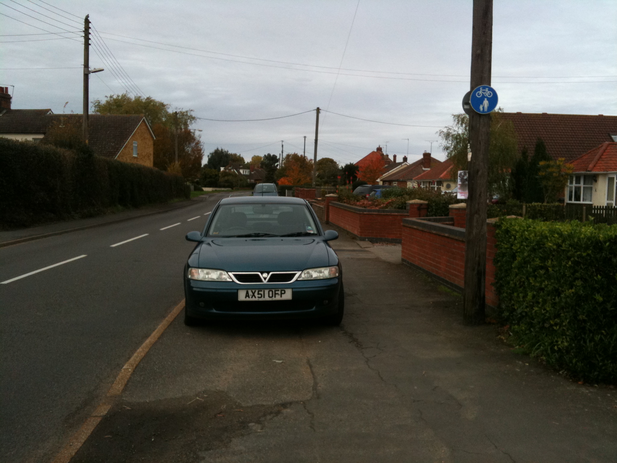 This car is parked on the pavement on a share-use path on Bell Lane in Kesgrave. There is good clearance to the side and there are no lines. It is a Sunday 3pm.