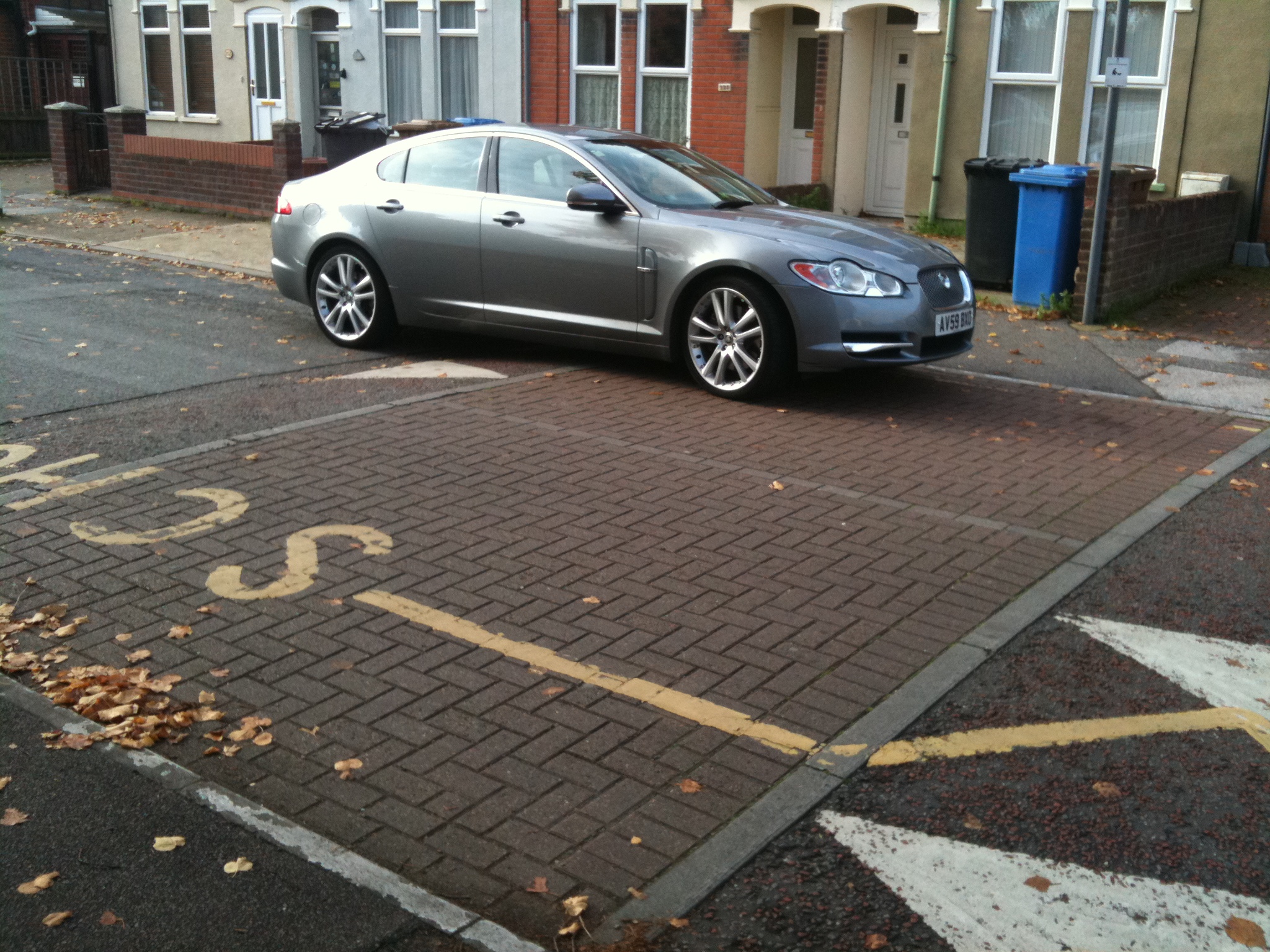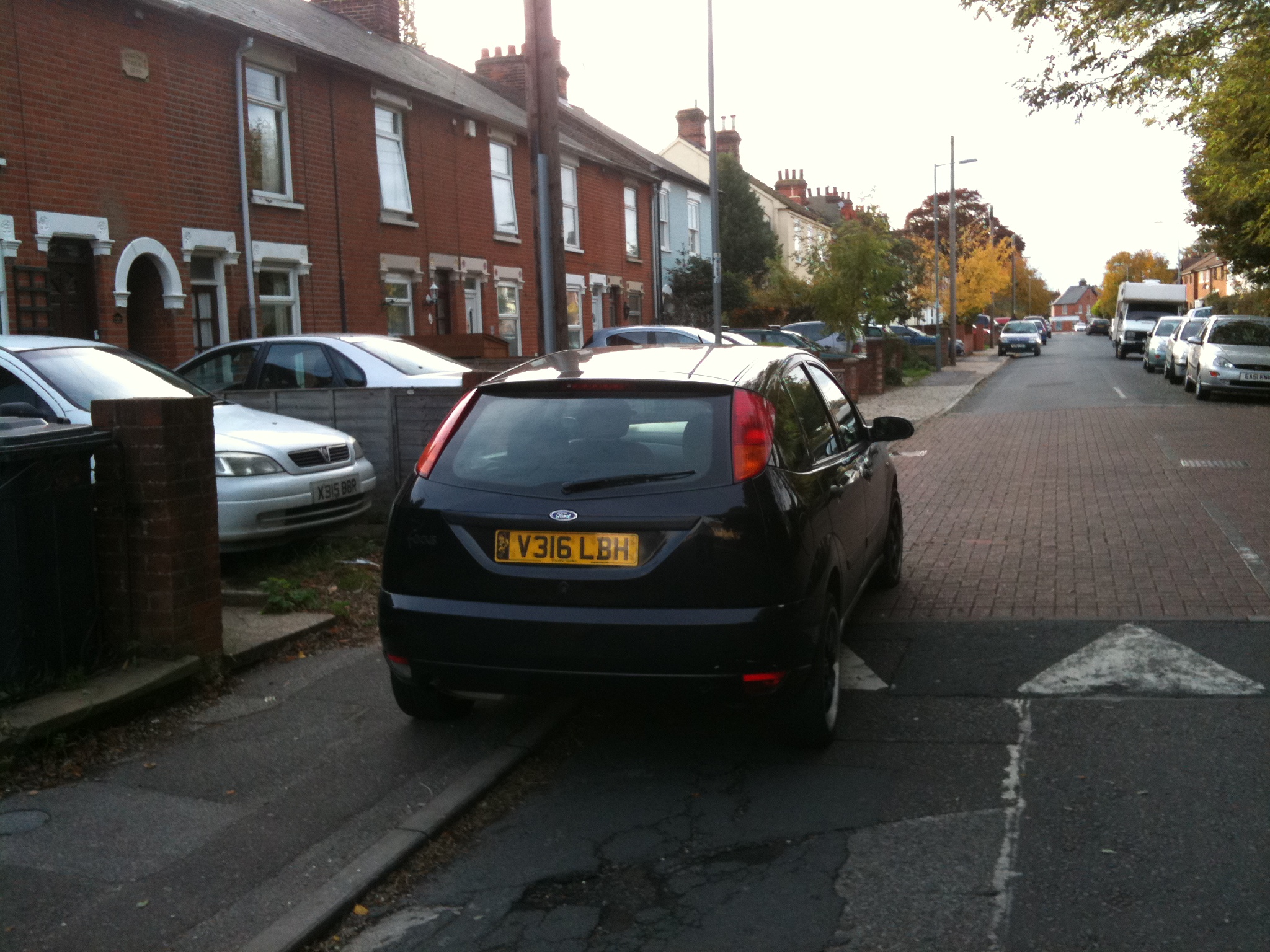 This car is parked on Freehold Road, Ipswich. It has it front two wheels up on a raised platform which is at pavement level and also has two wheels on the pavement. Sunday 5pm.