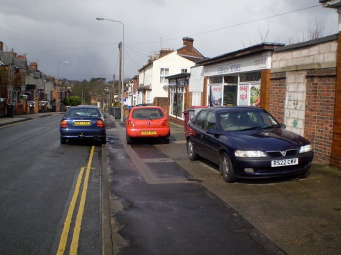This car is parked across the pavement outside a post office/coop on Cauldwell Hall Road, Ipswich. There are double yellow lines. The paved area to the right belongs to the shop where there is room to pass. It is 12noon Saturday